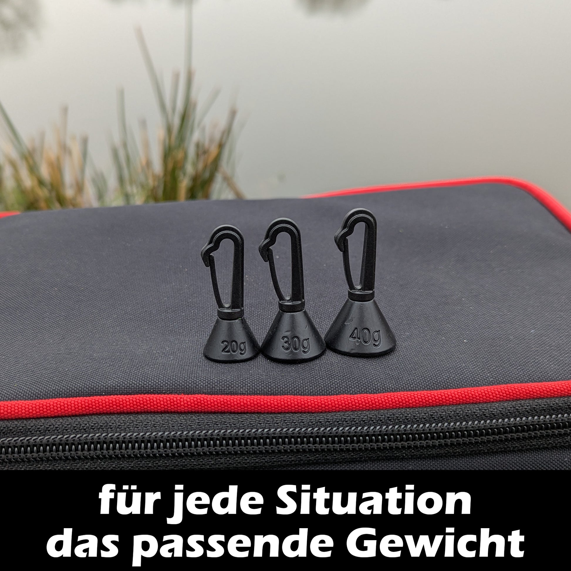 Immer das passende Gewicht dabei: Egal, ob Du kurze Distanzen oder große Entfernungen beangelst, wir bieten Dir die idealen Gewichte für jede Strömung: 20 g, 30 g und 40 g.