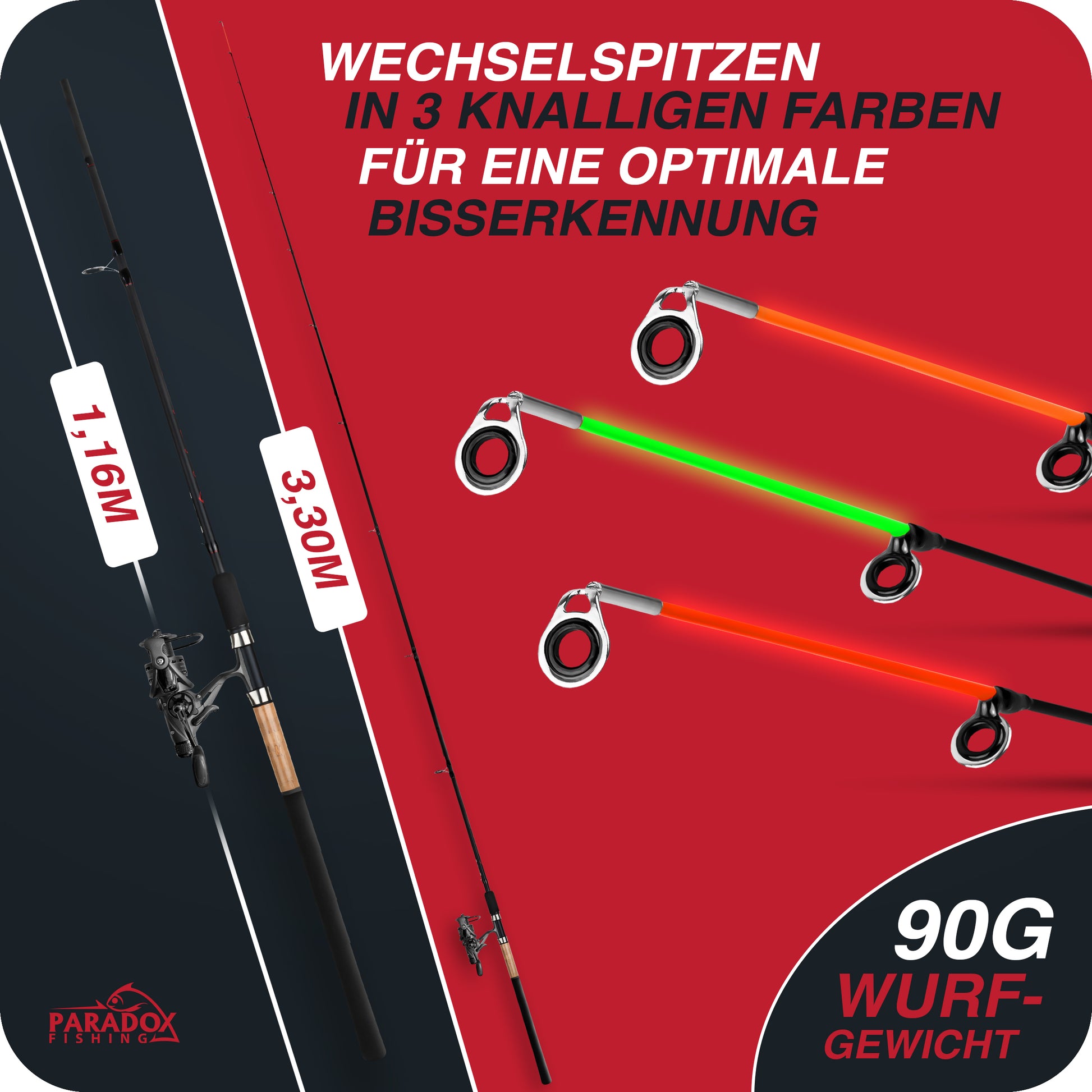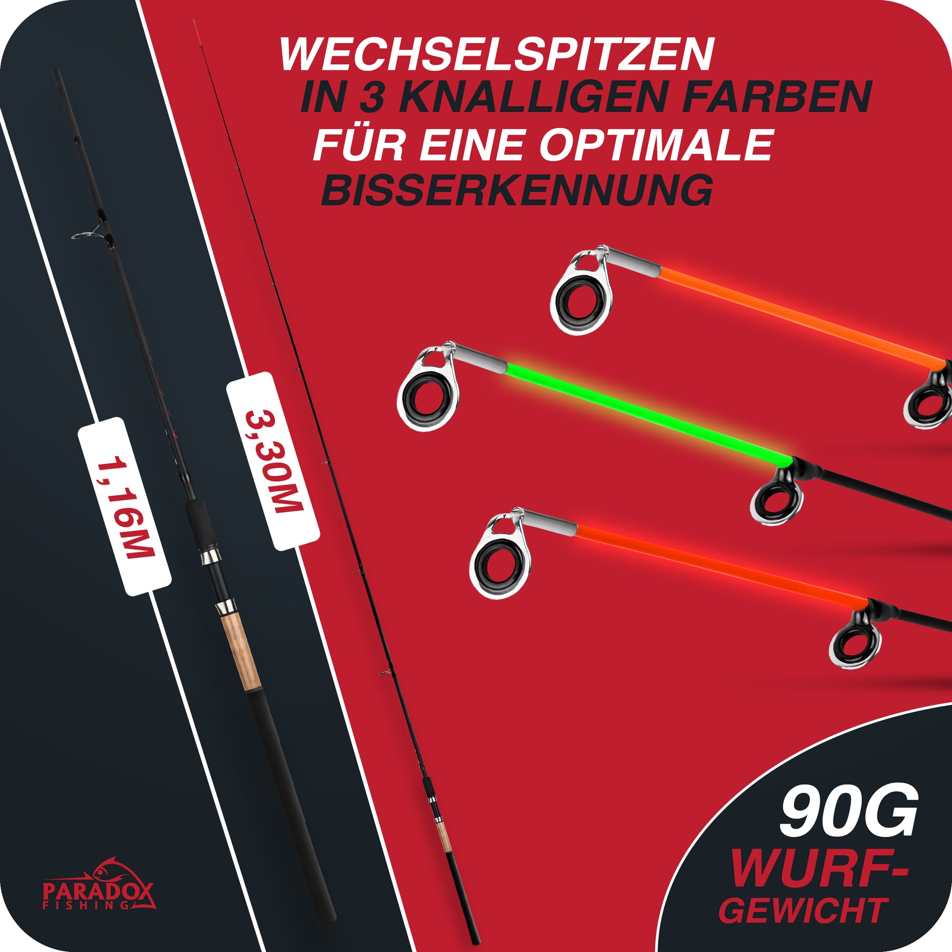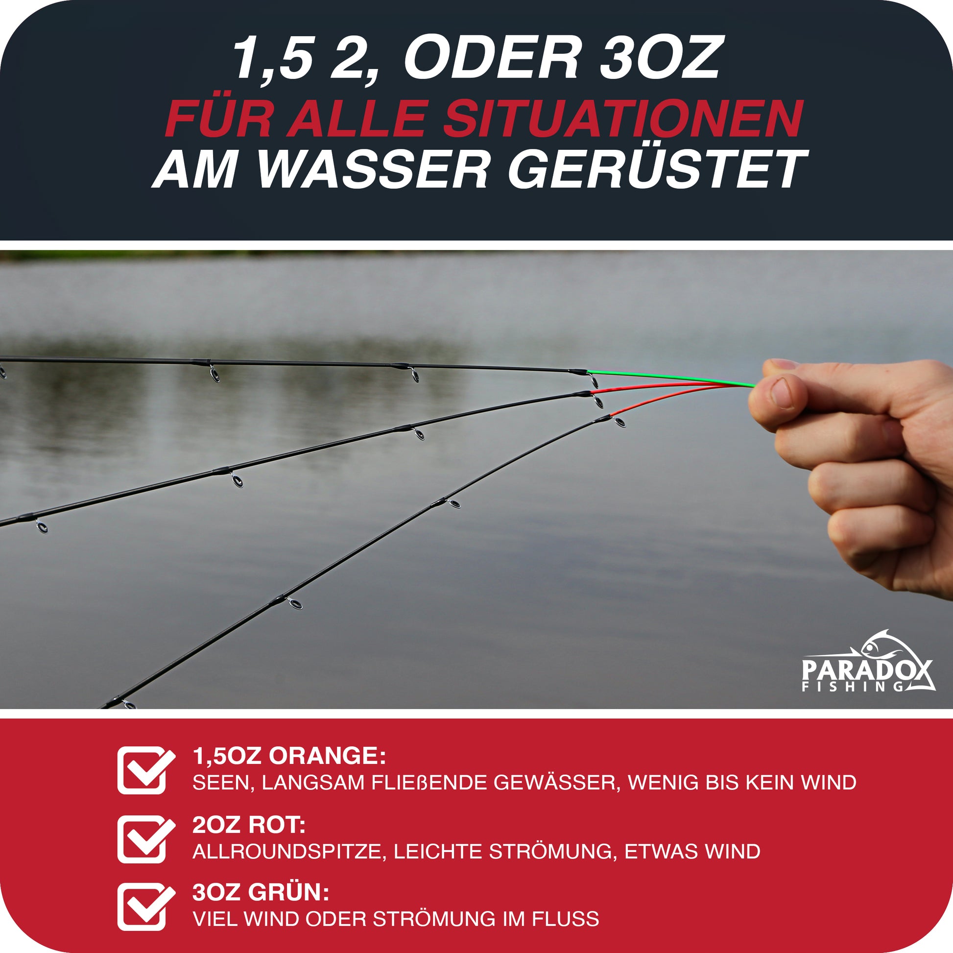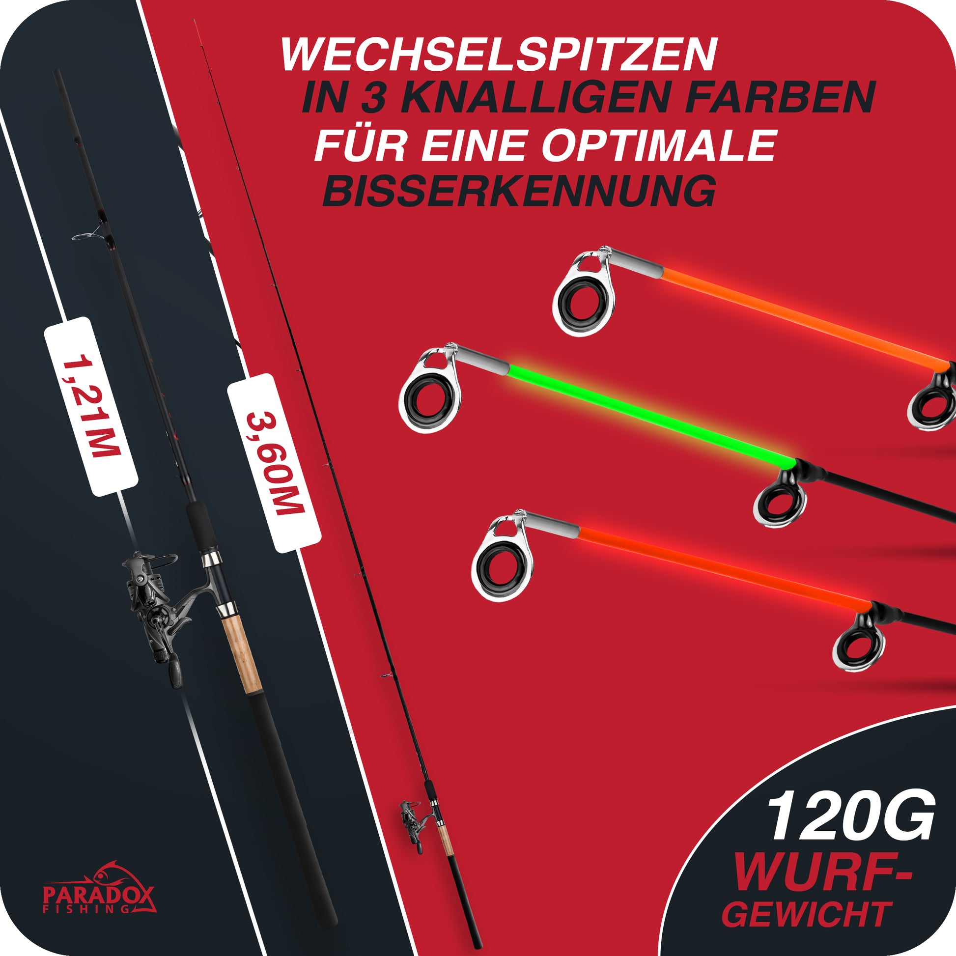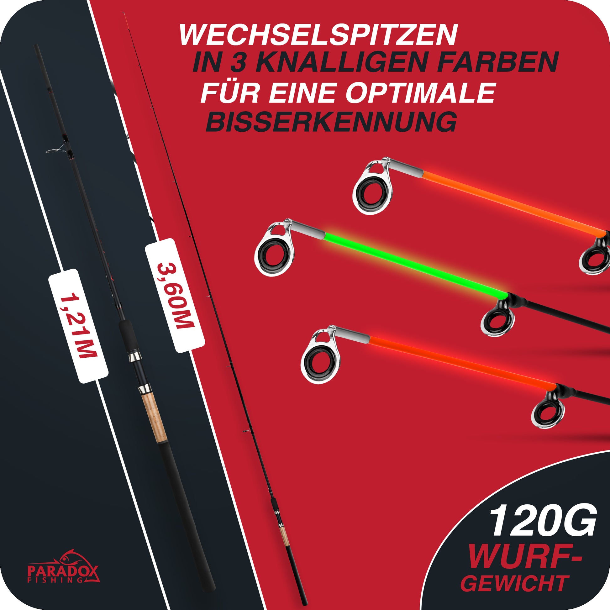 IMMER DIE BISSE GUT ERKENNEN: Wir haben uns bewusst für die am besten sichtbaren Spitzenfarben Rot/Orange und Grün entschieden. So kannst Du die Feederspitze immer gut erkennen und selbst feine Bisse sicher verwerten.