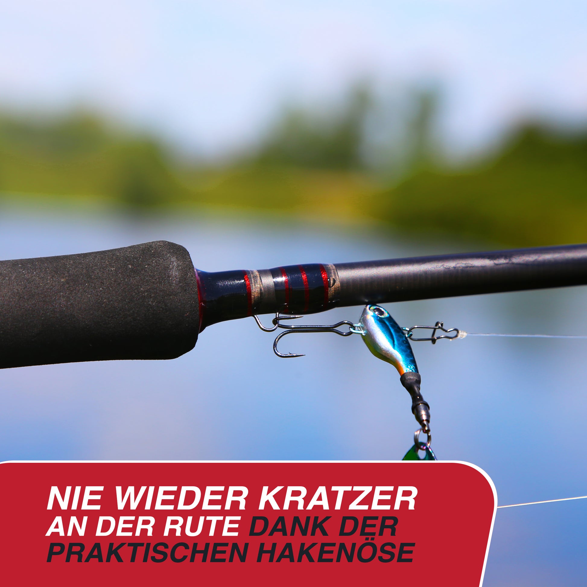 Haken vorsichtig handhaben: Decken Sie die Angelhaken immer ab oder entfernen Sie diese von den Ruten für den Transport. Verwenden Sie Korken oder Hakenschutzhüllen, um versehentliche Verletzungen zu vermeiden.