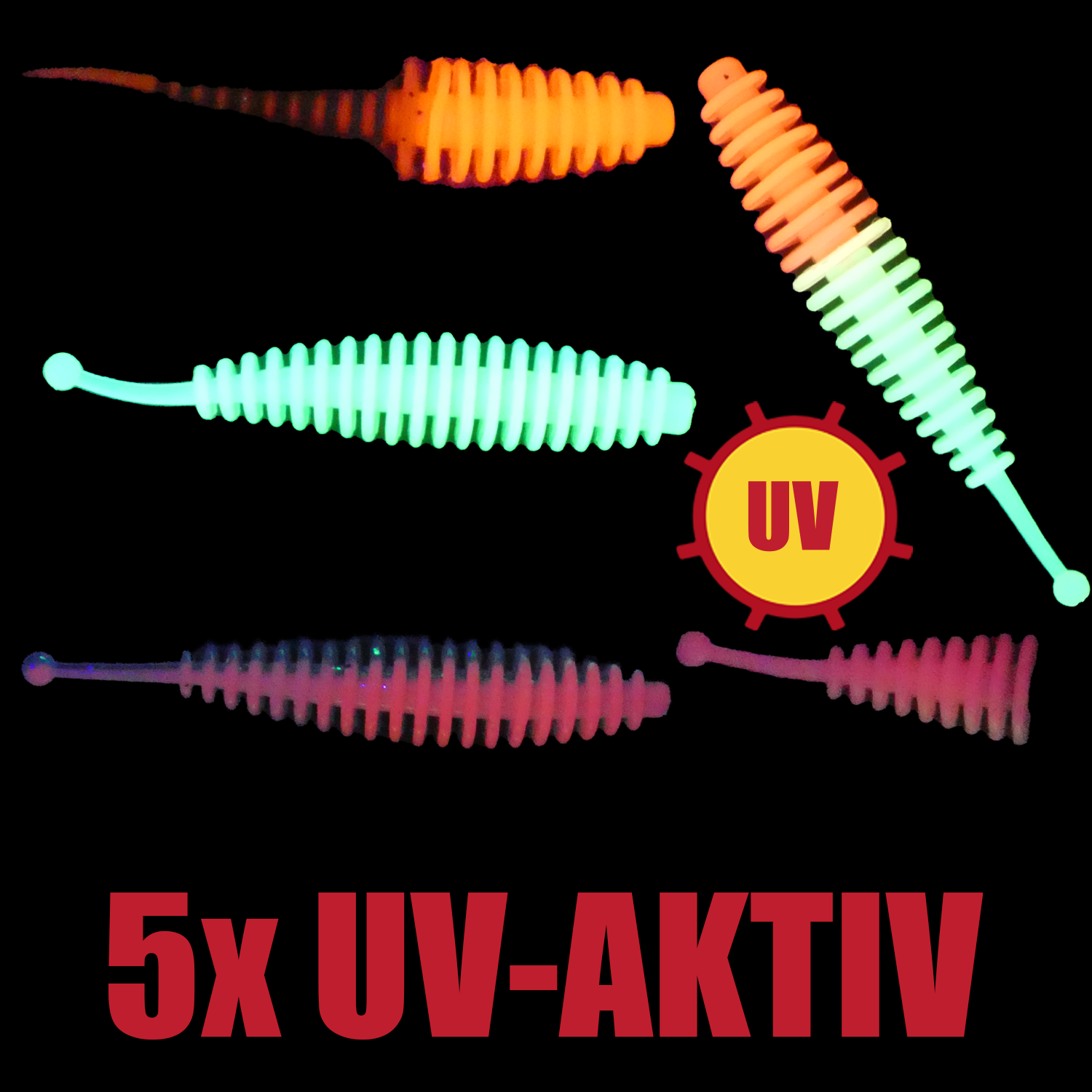 Lieferumfang: Du erhältst je 5 Forellen Gummis (5,2cm – 0,84g) in 5 verschiedenen fängigen Farben.