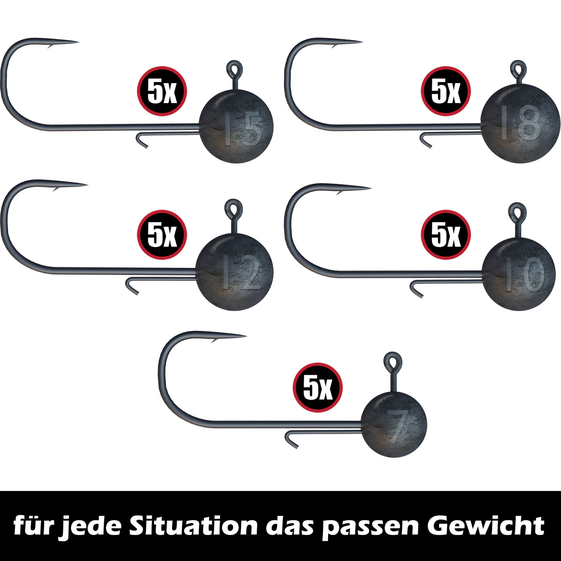 Bereit für jede Situation - Mit diesem Jigköpfe Set hast Du eine große Auswahl der gängigsten Gewichte immer am Wasser dabei - Perfekt für Hecht und Zander