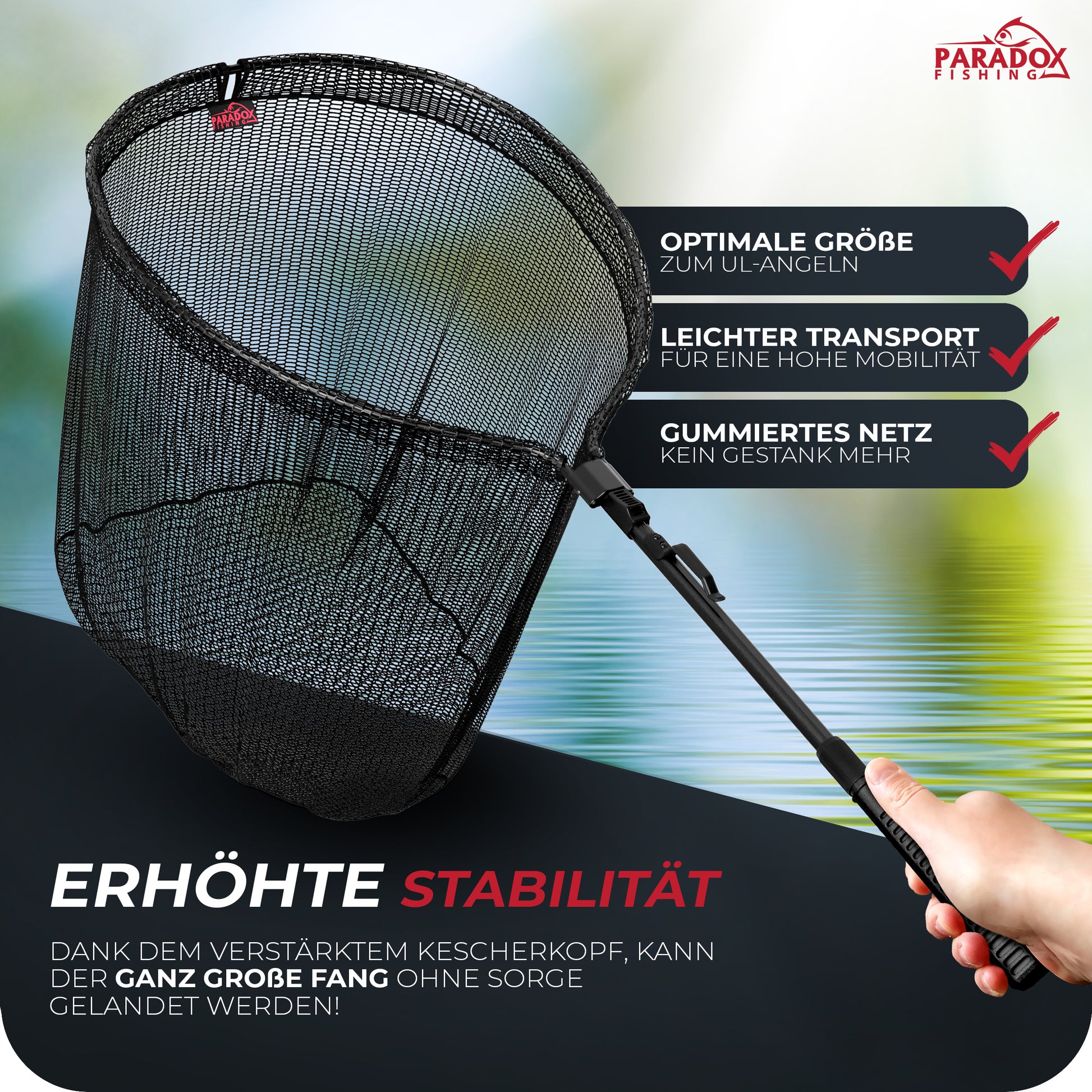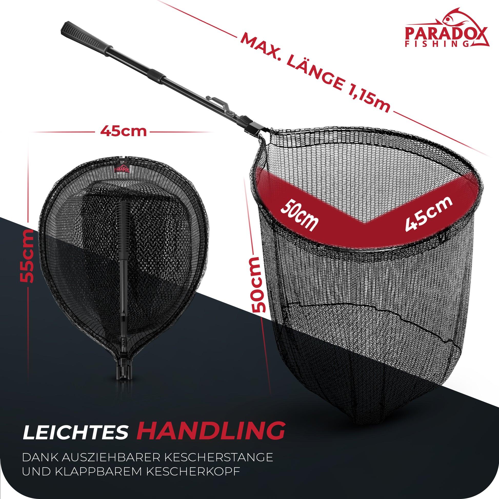 Der Paradox Fishing Raubfisch Kescher ist ein unverzichtbares Werkzeug für jeden Raubfischangler, der hoch mobil beim Angeln bleiben möchte. Mit einer Länge von 1,15 Metern bietet dieser Kescher die ideale Balance zwischen Handlichkeit und Funktionalität, so dass du mühelos auch große Fänge sicher landen kannst.