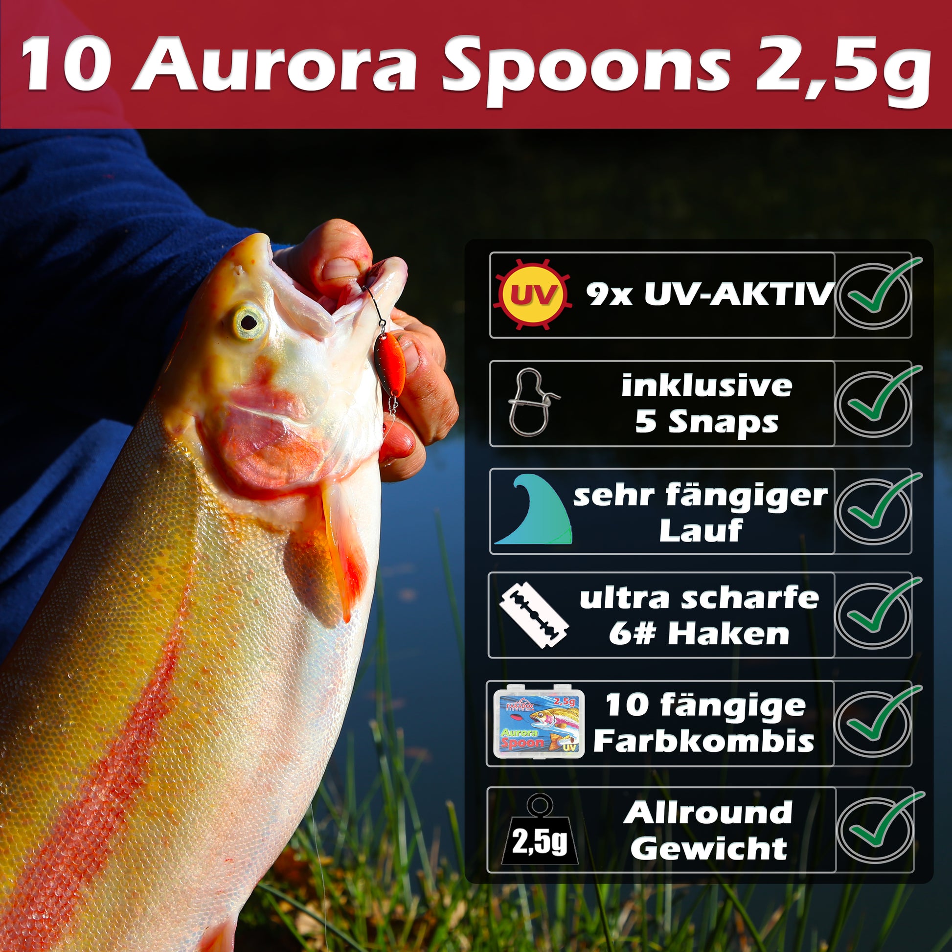 | Komplett-Set | Rute + Rolle PLUS: 10 Aurora Spoons (2,5g), 150 m 8x PX Geflochtene Schnur (0,07mm, 4,6kg), 30 m Fluorocarbon (0,20mm) | Das Rundum-Sorglos-Paket: alles dabei, was Du brauchst! |