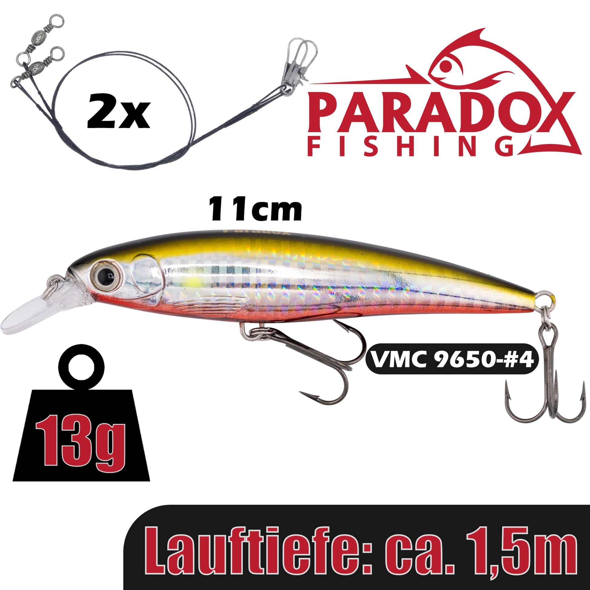 Inhalt: 4 Wobbler (13g, 11cm), plus 2 praktische Stahlvorfächer für den sofortigen Einsatz und zusätzlichen Schutz vor Hechtbissen.