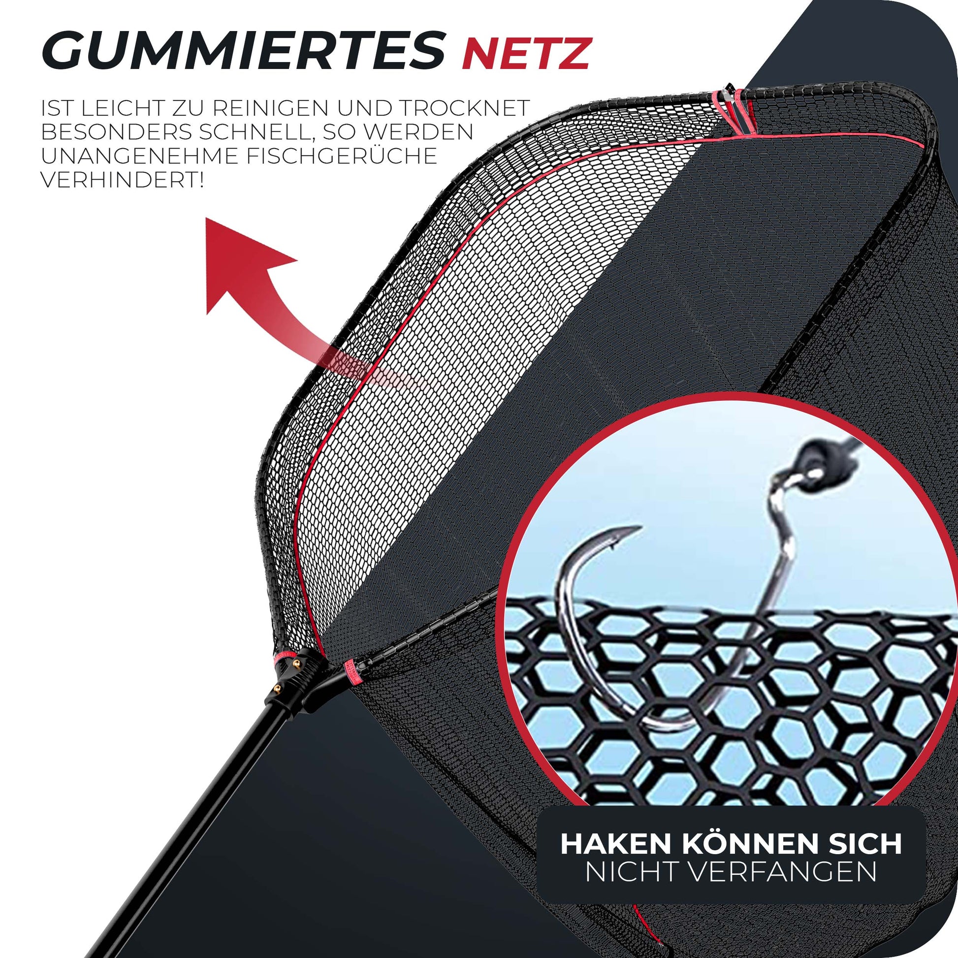 GUMMIERTES NETZ – Kein Verheddern: Das Netz ist komplett gummiert. Dadurch verfangen sich Haken nicht wie bei herkömmlichen Stoffnetzen – das schont Deine Köder und ist ideal für den Fisch.